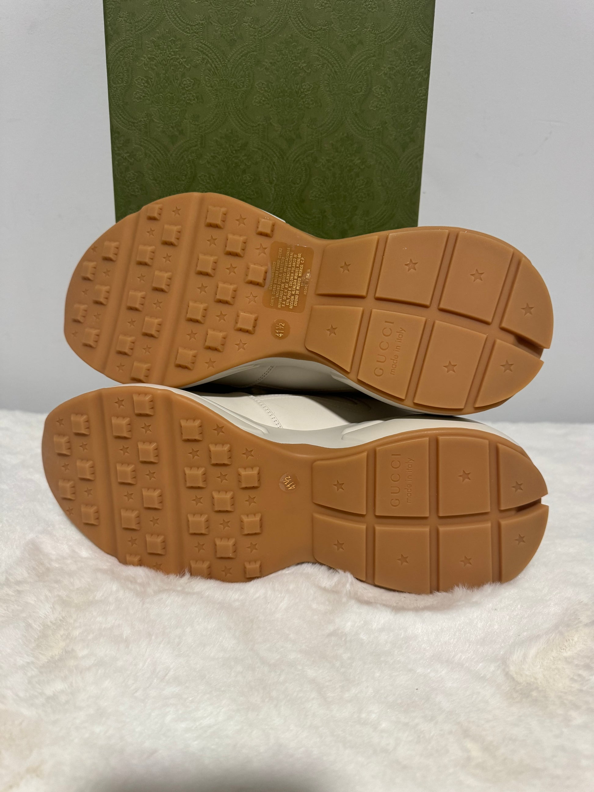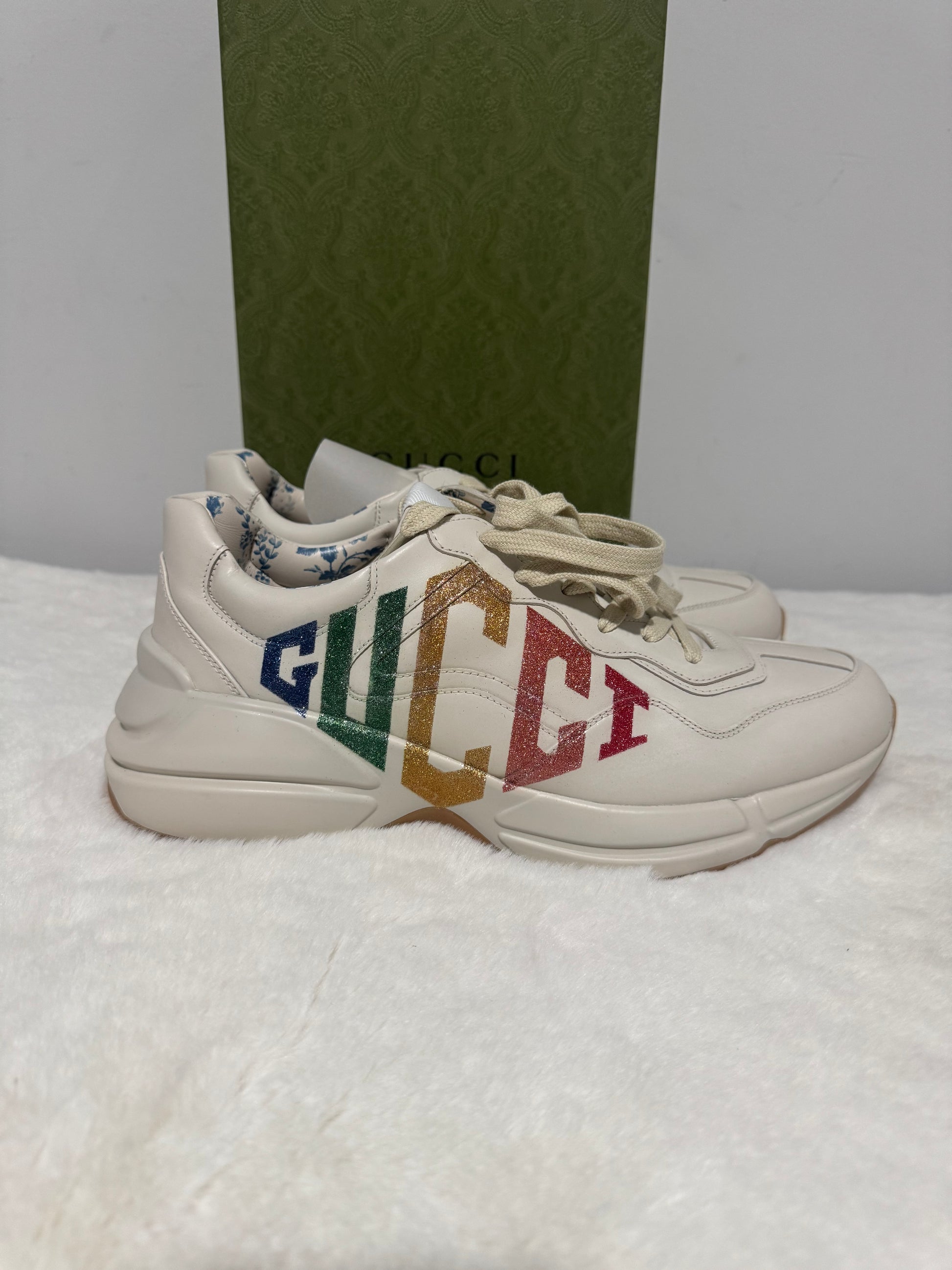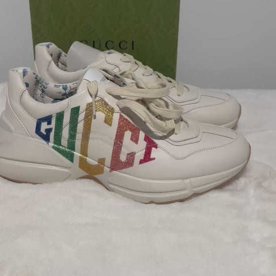Gucci Rhyton Platform Calfskin Glitter Logo Womens Sneakers Mystic White